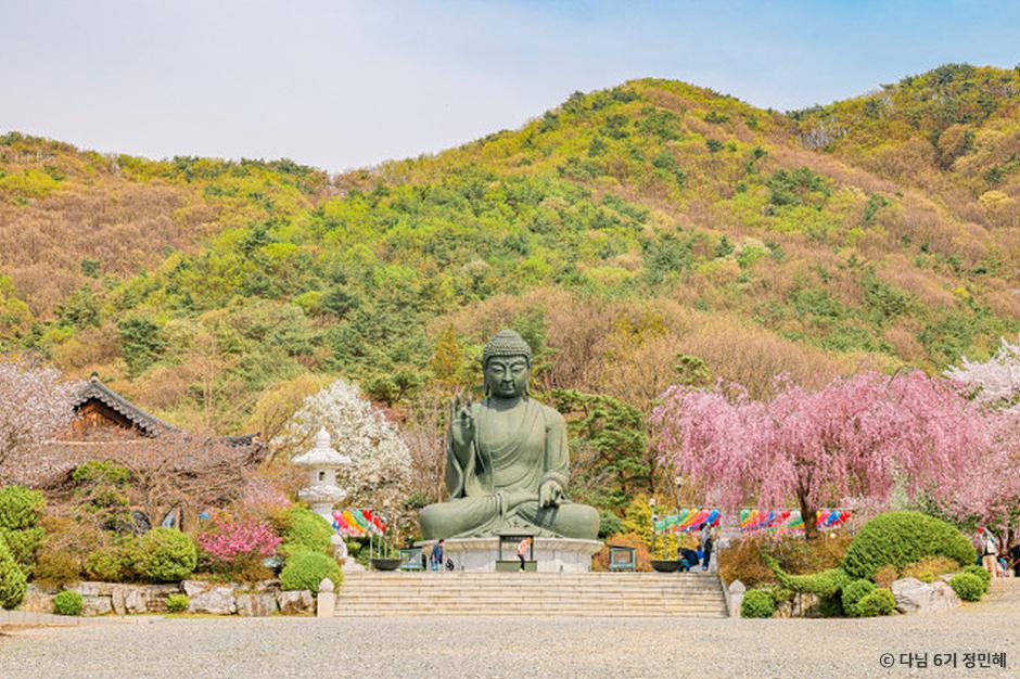 천안에 위치한 각원사는 겹벚꽃 명소로 유명합니다. 이곳에는 통벚꽃, 능수벚꽃 등 다양한 형태의 벚꽃을 감상할 수 있는데 특히 높이 15m, 무게 60톤에 달하는 청동대불 주변에 흐드러지게 핀 벚꽃은 또 다른 매력을 선사합니다.